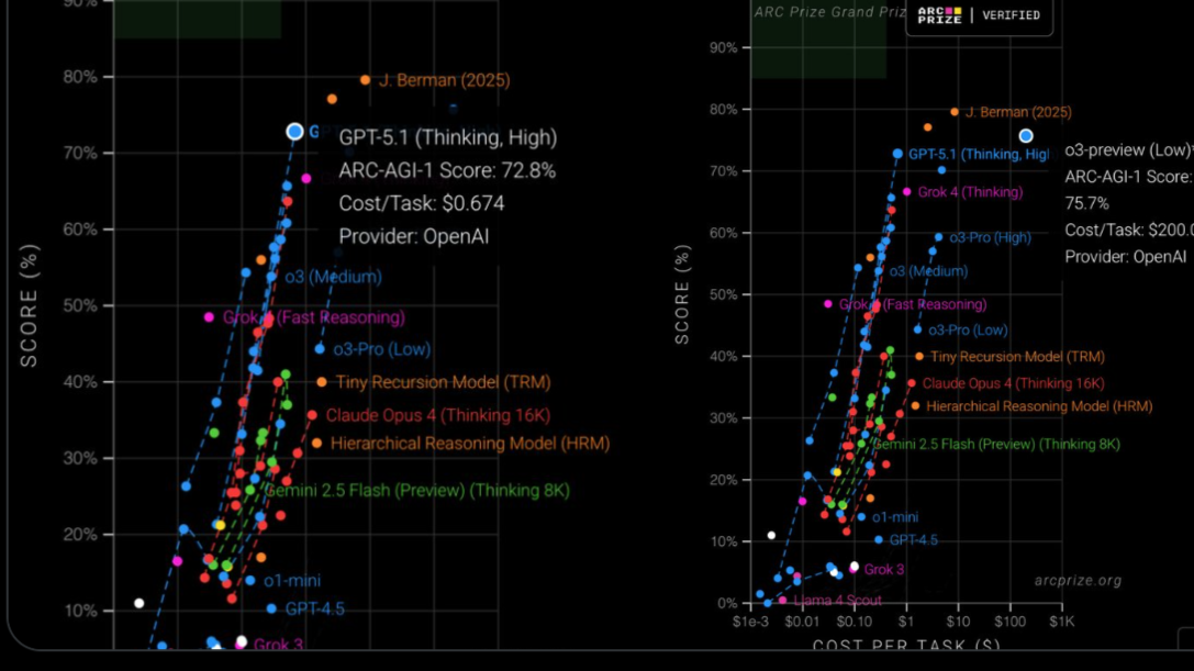 根據 X 上開發者 Chris 分享的測試,比較 GPT-5.1 的「Thinking High」與顯示較舊架構的 o3-preview(Low)後發現,前者在每次任務的成本上約便宜了 300 倍,但在 ARC-AGI-1 這類推理評測上的表現只略低幾分。帖文提出「人工智慧的價格一年大幅下跌」的觀察,引發網路討論。