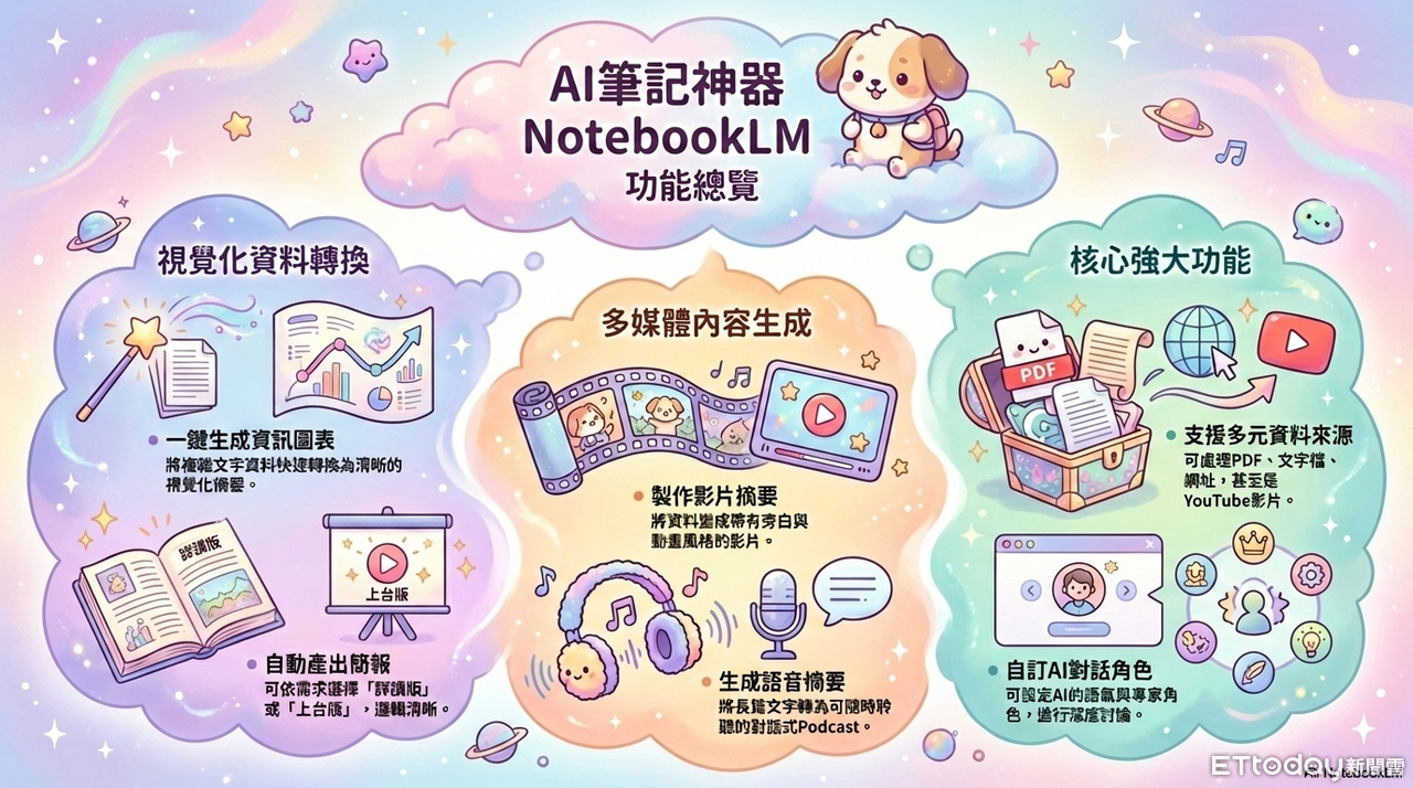 高效資料整理與轉換:NotebookLM 透過 AI 快速將資料轉換為易於理解的內容,無論是視覺化的圖表還是結構化的簡報,都能大幅提升學習與工作的效率。